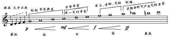 指挥必须熟悉人声每个声部的音域,和这些声部之间搭建起来的共鸣效果;在此基础上选择你自己单位的合唱队员;有时你的周围根本找不到合乎要求的合唱队员,但因为你了解基本的音域,就会灵活地选择好部分音域相近的队员,从数量上解决问题;例如许多单位没有很好音色的女低音,那就只能选择音区低一些的,人数比女高音声部多2、3个人,在共鸣平衡上就可以做些弥补。 这是第一女高音的音域与特征:
