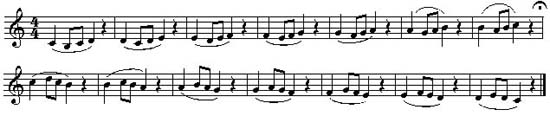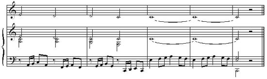 2、要求均匀地唱连续的两个音;放松、力度很轻地开始每个新的句子。所有的音都一个力度或每一小节唱渐强。同时仔细倾听钢琴伴奏中的进行。