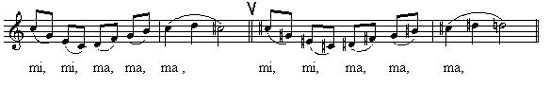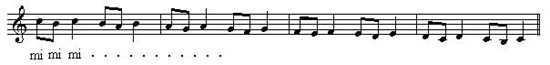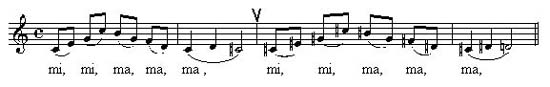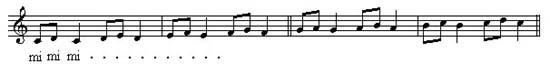 一边唱,一边对三和弦的构成骨干有所感觉。建立起支柱音,对以后的演唱十分有益。 12、下面的练习可以巩固所学过的片断,只是要进一步地要求高音的发声位置与较长的气息相结合,以使这些练习圆润,流畅,练习的成功同样也可以优美动听。每一片断练习之前可以将最高音听几遍,内心建立起气息、位置、舌头状态的准备意识。然后开始唱。每换一个半音,老师都应提醒大家。
