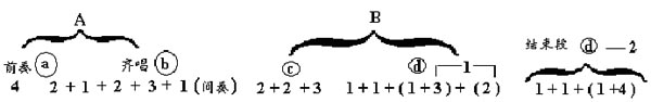 其中划圈的“师”与“秀”因为比前面的字高全音,很容易唱得象重音一样,因此在这里必须注意演唱时歌词的逻辑重音。 1、练习1:4的四拍图示 2、练习幅度变化的四拍图示。 3、练习后半拍的提示。 4、练习左右手的分工。 5、练习提示瞬间的力度变化。 1、伴奏在弹奏开头的部分时,指挥必须注意自己的气质;手可以轻轻地“跟挥”。但在开唱前的一小节手势要明显地表示出作品的基本速度与速率。 2、间奏是首先要给合唱队明确的收拍。右手在下方“跟挥”伴奏部分。在开唱前两拍有一个加速拍提示合唱队准备进入。 3、结束时,左手在上方帮助合唱队保持长音,并适时地给以收束提示。右手在下方“点击”伴奏节律,直到全曲结束。 至此为止,我们仍然还是一句话;指挥的艺术处理好坏,决定于他对作品的熟悉程度。希望大家在研究乐谱本身上多下功夫。