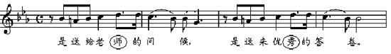 例如:“是写给老师的问候”一句,曲调是: