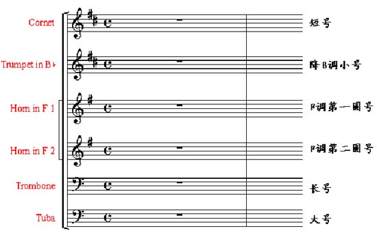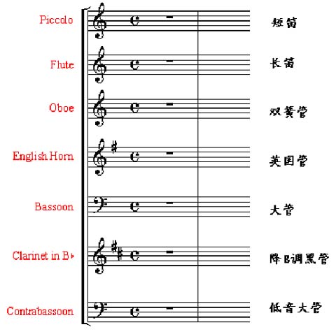 乐队的总谱是多行谱,根据乐器将它们编织在不同的声部组,分别为: 木管乐器组