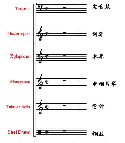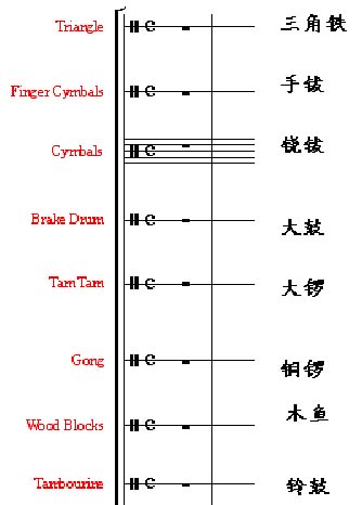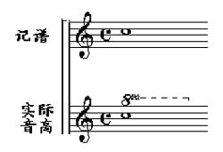 1、移位乐器:其实际音高常常比记谱高或低八度, 例如短笛(高八度)