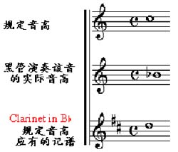 2、移调乐器不同,在同样的记谱条件下,与正常乐器的实际音高相差很大,例如降B调黑管,演奏小字二组的C音与小提琴的音高相差一个大二度。同样的,降B的小号也是如此。在乐队中黑管通常使用的是降B 与A调两种。但圆号大部分用F 调,萨克斯管用降E调,这些都要使用移调的读谱法来认识总谱。