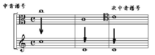 3、总谱中有的乐器是用C谱表记谱,即谱号的中间突起部分位置是中央C的音高,中提琴使用的是中音谱号。大提琴、大管、长号则有时会出现次中音谱号记谱。